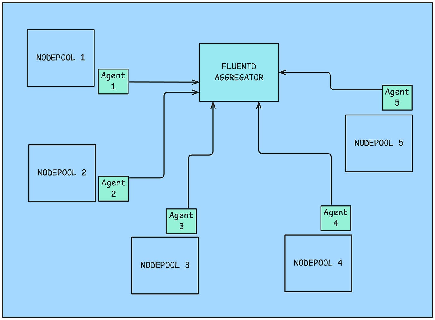 Fluentbit pods (agents), running as a part of a daemonset collected the logs from the services and just forwarded (using the fluent forward protocol) them to the Fluentd aggregator. The Agents ran as daemon-sets in their respective nodepools. You can configure a daemonset to run only on a specific set of nodes by setting node affinity.