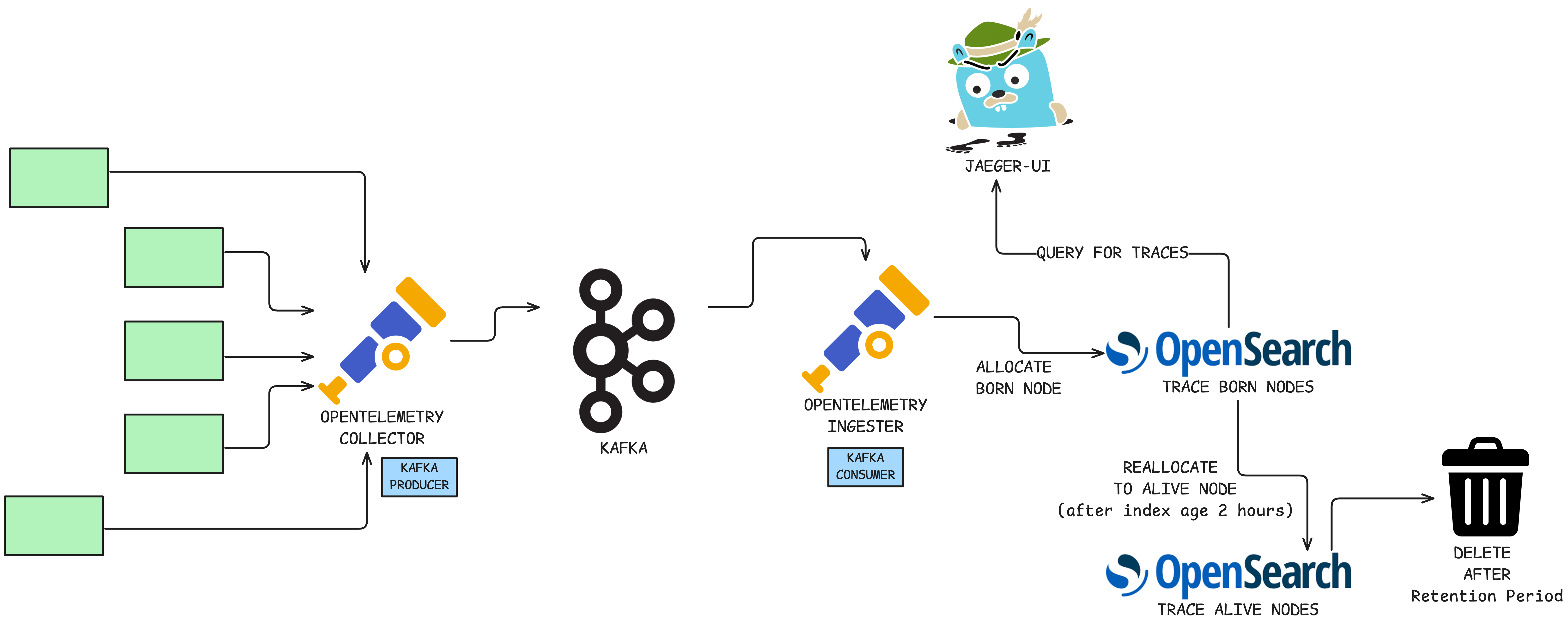 Otel Kafka Consumers read the spans and write them to OpenSearch.