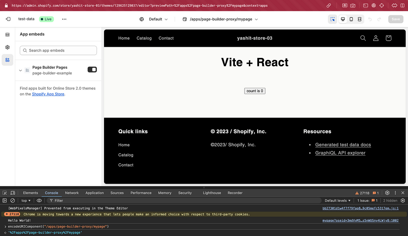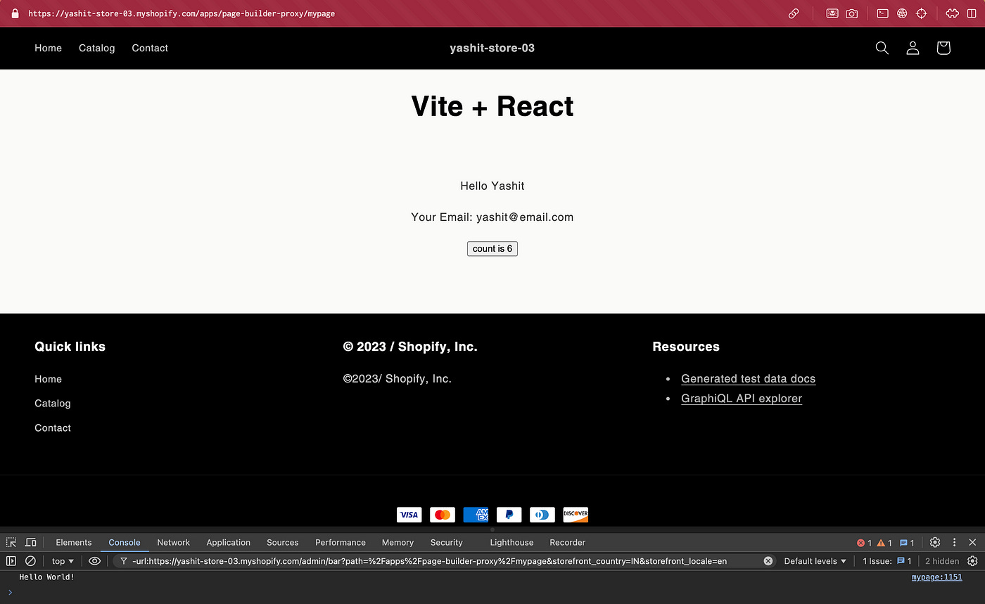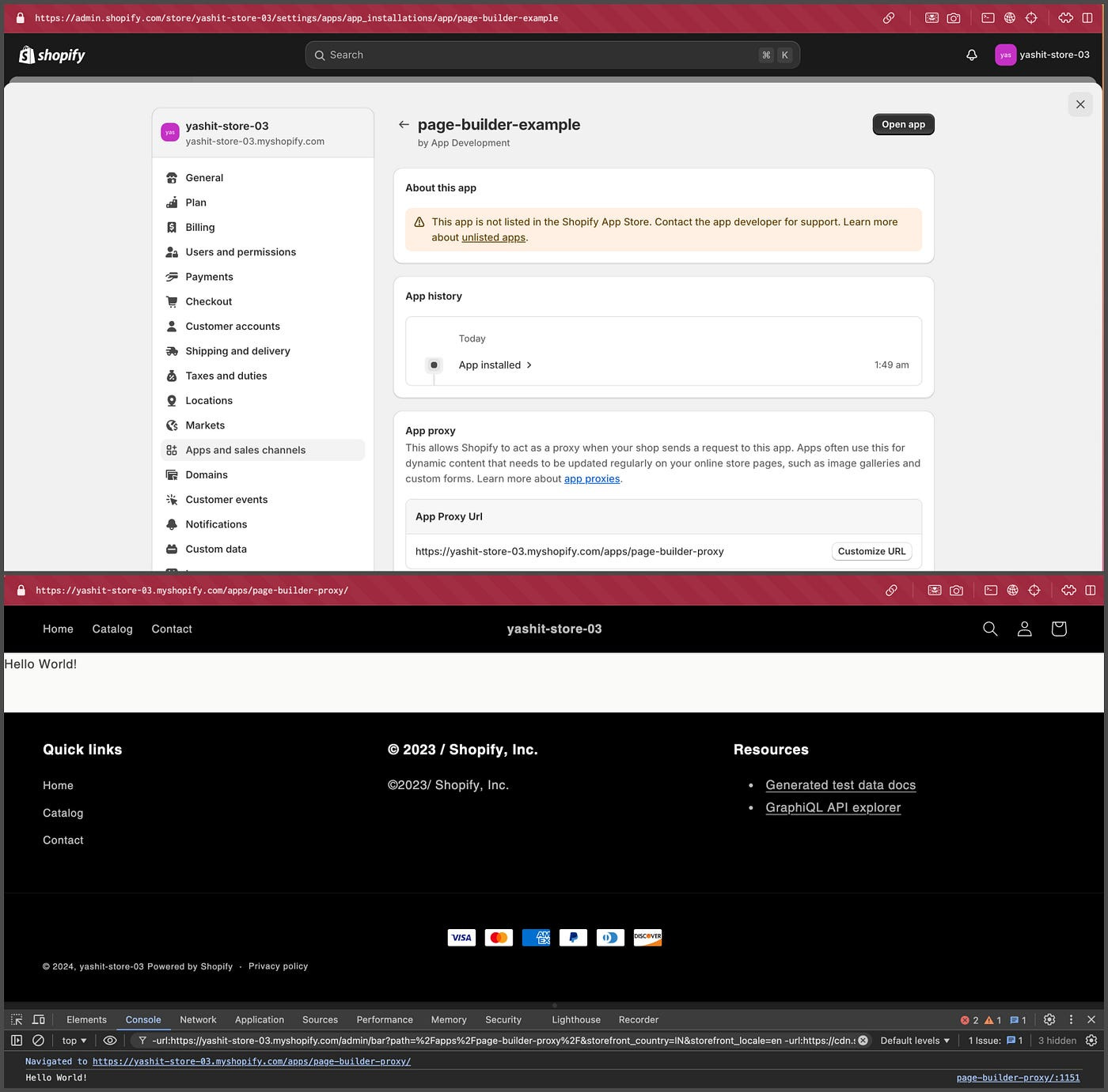 . You should see "Hello World!" rendered on the frontend and printed in the console.We can check the app proxy url in the store’s admin settings as well.