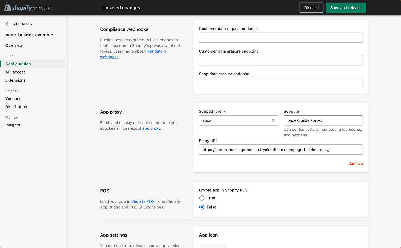 In the same page scroll down to the App Proxy section, paste the App URL and append
