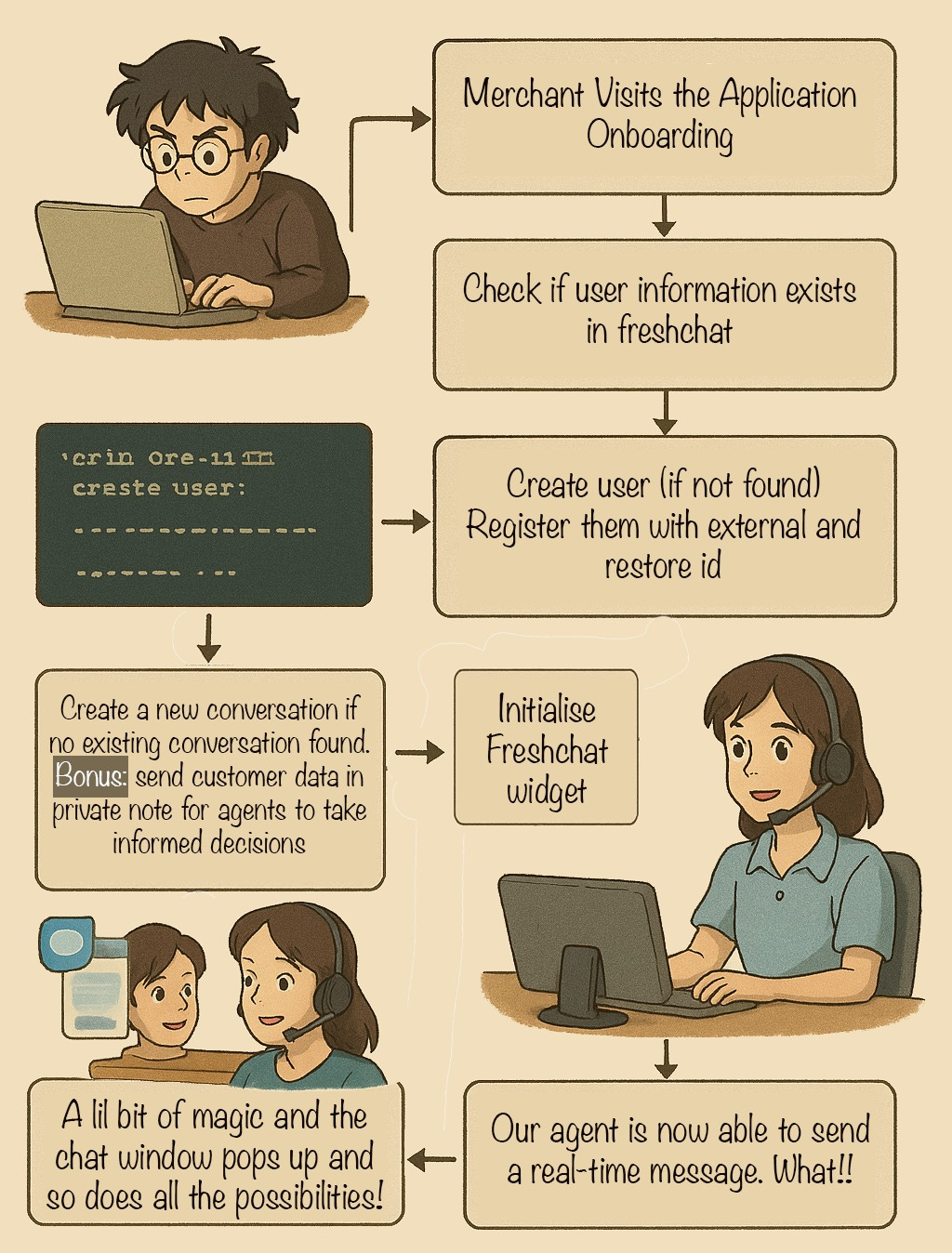 The breakthrough? Freshchat’s REST API lets us create conversations on behalf of users! That meant we could initiate chats before merchants even knew they needed help.