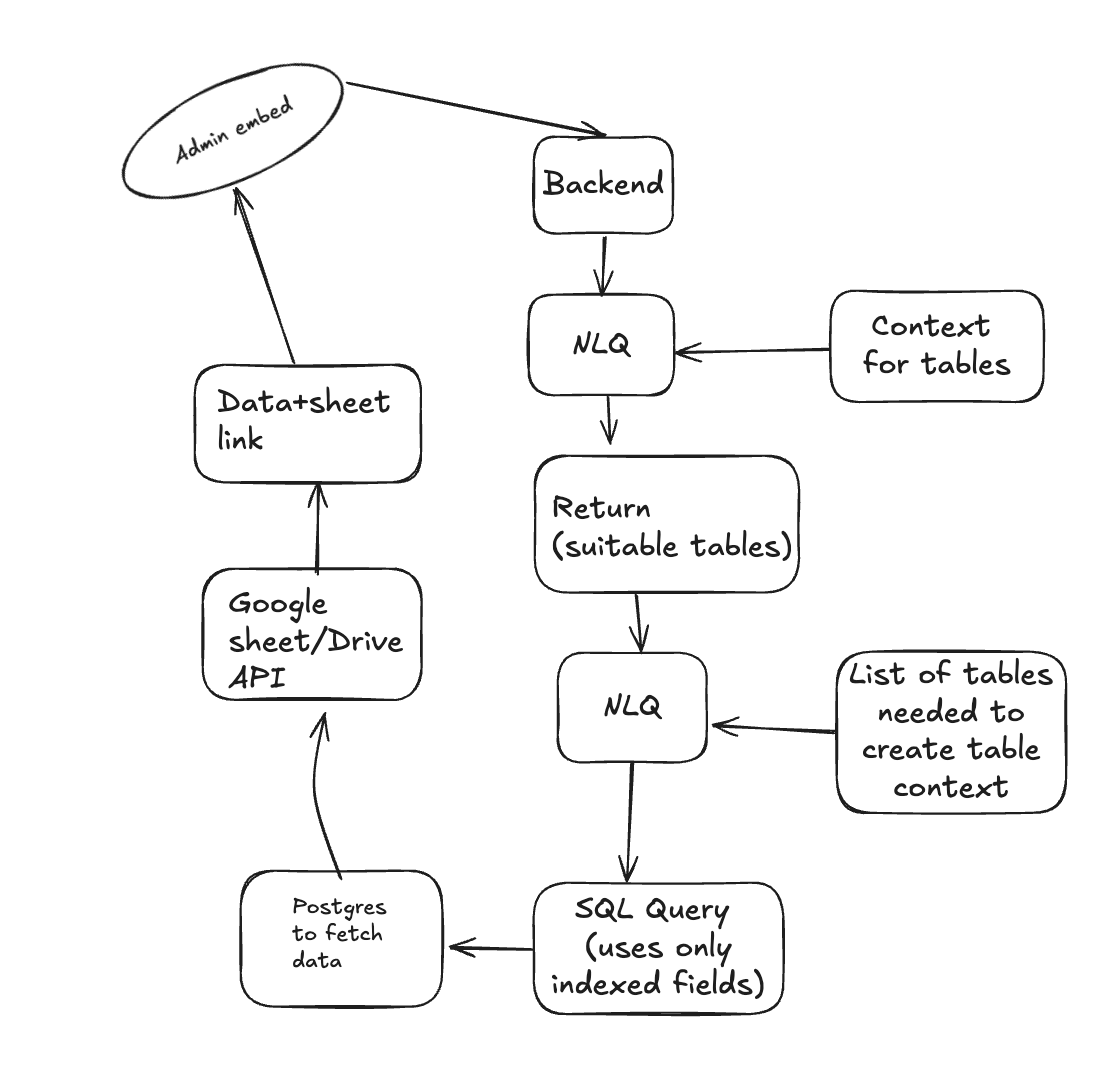 The process begins when an admin embed triggers the backend to handle a user's natural language query (NLQ).